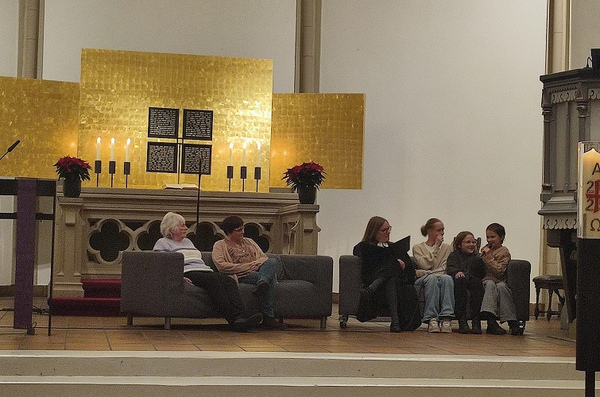 Während des Gottesdienstes führte Pfarrerin Melanie Jansen „Couchgespräche“ mit Menschen aus verschiedenen Generationen, die eine Geschichte mit der Kreuzkirche haben. Dazu gehörten Kinder der Soulkids ebenso wie (langjährige) Ehrenamtliche oder ehemalige Pfarrerinnen oder Pfarrer. So blickte der 92-jährige Herbert Tönnies auf 80 Jahre zurück – als Kindergottesdienstkind, Gottesdienstbesucher oder Presbyter und Finanzkirchmeister. Gisela Röbbelen, die seit mittlerweile 58 Jahren das Kammerorchester leitet, berichtete von weit über 100 Konzerten und regelmäßiger Mitwirkung in Gottesdiensten – und erzählte so manche Anekdote. Ute Brose, die seit ihrer Konfirmandenzeit als Kindergottesdiensthelferin oder Presbyterin ehrenamtlich in der Gemeinde tätig war und ist, hat seit einigen Jahren in der Kreuzkantorei eine Heimat gefunden. „Als ehrenamtliche Mitarbeiterin und Chormitglied tue ich etwas für andere, aber vor allem auch für mich selbst“, sagte sie.