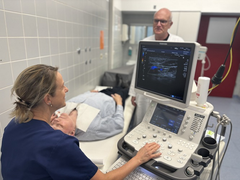 Chefarzt Dr. Ralf-Jochen Kuhlmann und Oberärztin Katja Würfel beim Check-Up der Halsschlagader eines Patienten am EvK Herne. FOTO: EVK