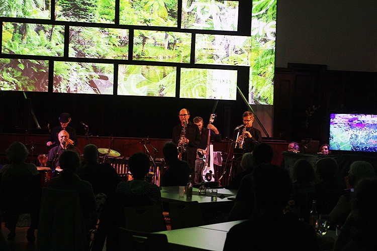 Alberto Acosta, der ecuadorianische Mitherausgeber des Bandes, führte mit der in Mexiko lebenden Journalistin Sandra Weiss durch das Programm. Acosta war Präsident der verfassungsgebenden Versammlung, die 2008 die Rechte der Natur in der ecuadorianischen Verfassung verankerte und setzt sich seit langem für den Schutz der Amzonas-Regenwälder ein. So freute er sich mitzuteilen,dass im August dieses Jahres hat die Mehrheit der Menschen in Ecuador in einem Referendum für das Ende der Erdölförderung und den Schutz Yasuní-Nationalparks gestimmt hatten, das eines der artenreichsten Bioreservate der Welt ist. Ein wegweisendes Votum für die Rechte der Natur, aber auch für die Rechte der indigenen Bevölkerung. An dem Abend wurde es von dem Grupo Sal Sextett musikalisch mit einem ecuadorianischen Volkslied gefeiert – visuell unterlegt mit einer Projektion von sattgrünen Regenwald-Bildern. Bei jedem Pluriversum Abend ist jeweils eine prominente Persönlichkeit aus einer anderen Region der Welt eingeladen, um zukunftsweisende Gedanken, Ideen und Konzepte aufzuzeigen und miteinander in den Dialog zu treten.