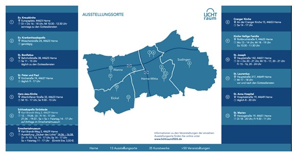 Vom 12. April bis zum 19. Juli gibt es in Herne die Ausstellung „LichTraum“. An zwölf sakralen Orten in Herne zeigt der Künstler Ludger Hinse seine Lichtkreuze. „Sie fangen das Licht ein, brechen und spiegeln es, setzen es in Bewegung – und laden den Betrachter ein, selbst Teil dieses Spiels zu werden“, heißt es im Programmflyer. Ludger Hinse verwandle die Ausstellungsräume mit seinn Lichtobjekten „in ein gemeinsames Erleben aus Farbe, Bewegung und Stille“.